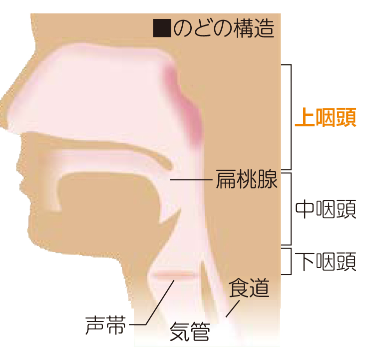 咽頭は場所によって上咽頭、中咽頭、下咽頭に分かれており、上咽頭は鼻の奥からはじまり、下咽頭はのどボトケの下あたりまでになります。