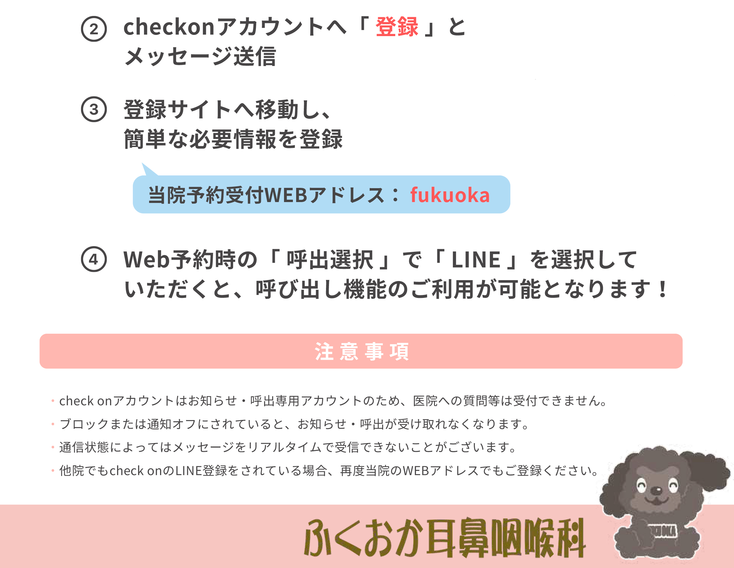 - check onアカウントはお知らせ・呼出専用アカウントのため、医院への質問等は受付できません。